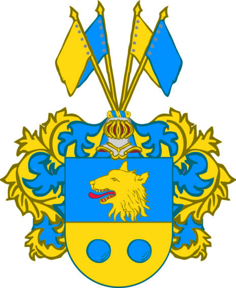 ”… Skiölden fördehlt i twäran uti twenne lijka dehlar, det öfra Fältet är blått, hwari wijsar sig ett Ulfwe-hufwud af Gull, det andra Fältet är af gull och därutj twenne blå Kuhlor. Ofwanpå Skiölden står en öpen Tornerhielm, hwaröfwer stå fyra Fahnor med Gull och blått, hwarom annan fördelte; Krantzen och Löfwärket är jembwähl af gull och blått, Aldeles som detta wapnet med deβ rätta färgor står afmåhlat.”