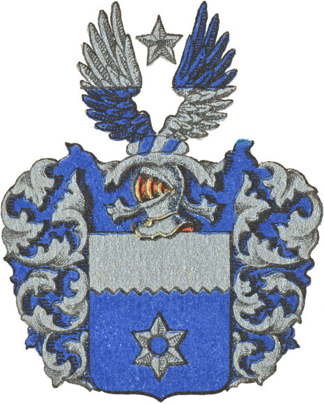 ”… En blå Skiöld, uti hwilken är en Molett af Silfwer, öfwerst i Skiölden är en tandig Chef af Silfwer; Ofwan på Skiölden står en öpen Tornerhielm, öfwer hwilcken lyser en stierna af samma metall, emellan twänne utslagne wingar af silfwer och blått hwar om annan fördehlte. Crantzen och Löfwärcket är af silfwer och blått, aldeles som detta Wapn med sine egentelige färgor här brede wid afmåhlat finnes.”