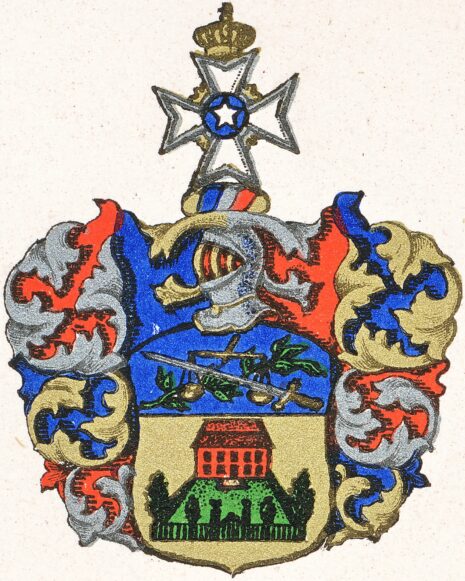 ”… En Sköld af guld, hwaruti et Rödt Hus af twänne wåningar upbygdt är, och framföre en gård af Silfwer innesluten, medelst et grönt gallerwärks Staguette uti halfrundning å bägge sidor, men jämt framtil, hwaräst innanföre Fyra gröna pyramiderade Trän planterade äro: Ofwanföre uti en blå Chef, hänger en gyllende wigtskåhl, underlagt ifrån wänster med et Swärd, hwars fäste innåt wändt är af guld, och klingan af Silfwer, öfwerlagt ifrån höger korswis med en grön Lager-qwist, ofwan på Skölden står en öppen Tornerhielm, hwaruppå Kongl Nordstierne Ordens korszet stält är. Hielm-Krantsen och Löfwärket är af Silfwer, blåt och rödt, aldeles som detta Wapen med sine egenteliga färgor här bredevid afmålat finnes.”