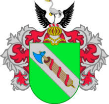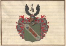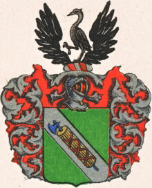 ”… En Grön Skjöld och en deruti förekommande Bande af Silfwer, belagd med en Romersk Fascis, eller Knippa af smala Stafrar, omkring en Blå Bila, samt Tre Hwarf omlindad med ett rödt Band. Ofwan på Skjölden sees en Öppen Tornere Hjelm, hwaruppå emellan Twenne swarta utslagna Örnewingar, står en mot Höger wänd wakande Trana af Naturlig Färg. Hjelm Krantsen är wriden af Silfwer och Rödt, och Skjölden är omgifwen med ett i Löfwerck brutit Wapentäcke af Silfwer med Röd Underfodring. Aldeles som det samma med sina egenteliga Färgor här afmålat finnes.”