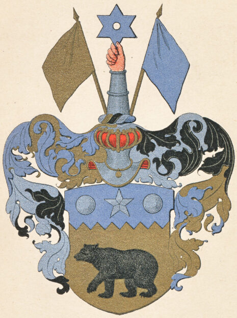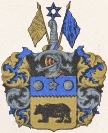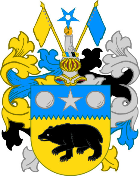 ”… En Skiöld af Gull, hwaruti går en swart Biörn. Öfwerst i Skiölden är en uddig Chef af blå Färg, hwaruppå lyser en Stierna af Silfwer emellan twänne Kulor af samma metall. Ofwan på Skiölden står en öpen Tornerhielm, utur hwilken sträcker sig en dehl af en bewäpnad Arm som med Handen håller en blå molet emellan twänne Fanor, hwaraf den högre är af Gull och den wänstre blå. Krantsen och Löfwerket är af Gull, Silfwer, blått och swart, aldeles som detta Wapen med sina egenteliga färgor här bredewid afmålat finnes.”