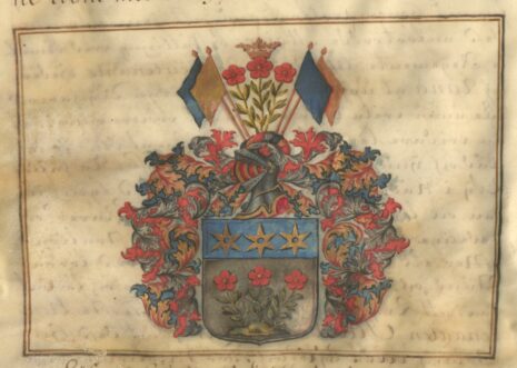 ”… En Skiöld af Silfwer, hwaruti sees tre röda Rosor, på sina gröna Stielckar, wäxande på en grön Backa. Ofwerst i Skiölden är en Chef af blå färg Zijrad med trenne gyllende Moletter. Ofwan på Skiölden står en öppen Torneerhielm hwarutur upstiga äfwen slijke tre Rosor som i Sielfwa Skiölden, emellan fyra uthslagne Fahnor, af Gull och blå färg hwar om annan fördehlte, warandes den medlersta af Rosorne krönt med en Gyllende Krona. Crantzen och Löfwärcket är af Gull, Silfwer, Blått och Rödt, aldeles som detta Wapen med deβ egentelige Färgor här hos afmåhlat finnes.”