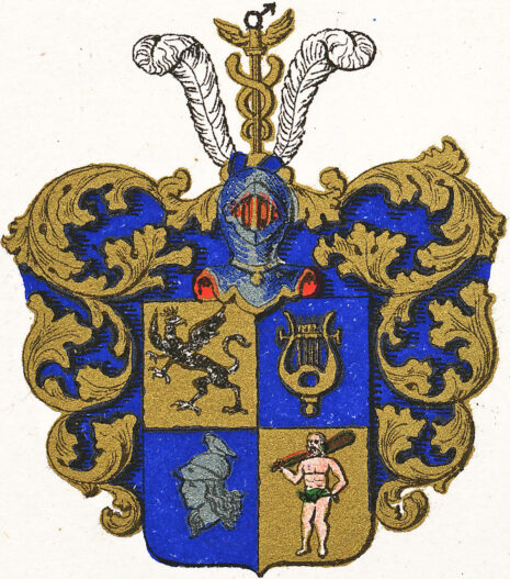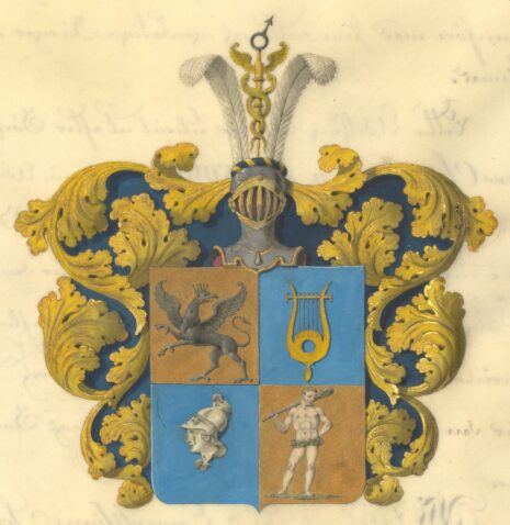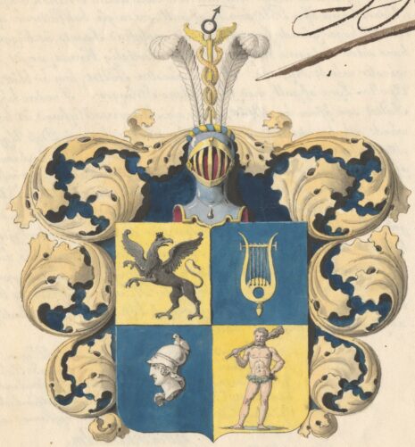 ”… En i fyra lika delar klufven och tvärdelad Fransk Skjöld, i hvars högra öfra Fält, som är af gull, ses en på bakfötterne uprest, till höger gående swart Grip, med uplyftad Svans, åt bägge hans sidor utslagna wingar och med Hertiglig Krona prydt, till vänster vändt hufvud. I öfra wänstra Fältet, som är blått, ses en Apollo-Lyra af gull med fem gyllene strängar. I nedra högra Fältet som äfven är blått, visar sig Minervas hufvud, åt höger wändt och betäckt med en hjelm eller Casque, hvarpå dess Uggla sitter; altsammans af silfver. Nedra vänstra Fältet är deremot af gull, i hvilket en Wild Man ses stående på en liten frånskilljd grönskande Mark, hållande med högra handen sin på Axeln hvilande Klubba, men den vänstra Armen intill sin sida, och om lifvet omwefvad med en grön Ekelöfs-krans. På Skjölden står en öpen Torner-hjelm, belagd med en af gull och blått sammanvriden hjelm-krans, hvaruti imellan tvänne utåt weftande hvita Struss-fjädrar, ses uprest Mecurii Staf af gull, öfverst bärande Martis eller Jernets tecken af stål. Skjölden omgifves af Löfwerk, som utvändigt är af gull, men innantill blått. Aldeles som detta Wapen här frammanföre med sina rätta och egenteliga Färger afmåladt finnes.”
