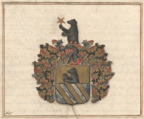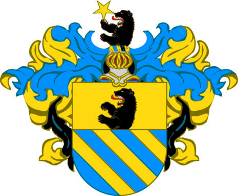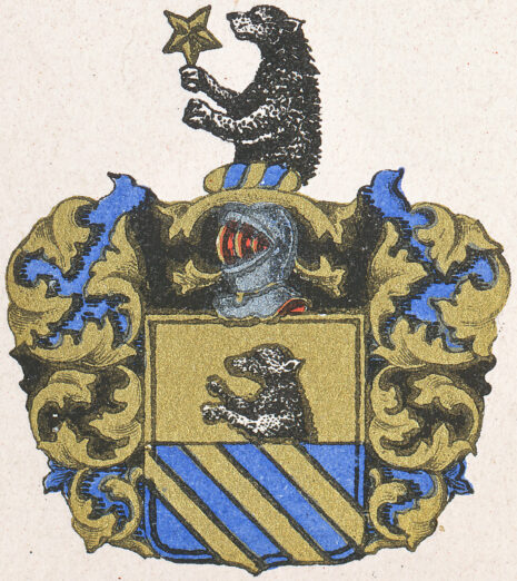 ”… En Skiöld i twäran fördelt i twänne lijka delar eller Fält, hwar af det öfre är af gull, hwar uti upstiger öfre delen af en swart Biörn, och det nedre Fältet blått, öfwer hwilcket gå trenne bander af gull. Men åfwan på Skiölden står en öppen Tornerhielm, hwar utur upstijger öfre dehlen af een swart Biörn, som håller med högra Rahmen en Stierna af Gull; blifwandes Crantzen och Löfwärcket af Gull, Blått och Swart, aldeles, som detta Wapnet med sina rätta och egenteliga Färgor här åfwanföre afmåhlat finnes.”