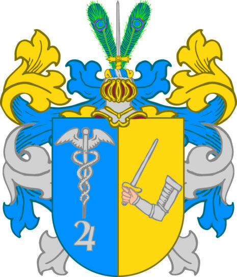 ”… en Skiöld i längden fördelt i twänne lika dehlar, warandes det högre fältet blått, i hwilket sees en Mercurii staf af Silfwer, åfwanförr Signum Jovis af samma Metall, det wänstra Fältet är af Gull, med en kröckter bewäpnad arm uti, som håller med handen en baar wärja; Ofwan på Skiölden är en öppen Tornerhielm, hwar uppå står en bar wärja med spetsen upåt, emellan twänne Påfågle fiädrar, Crantzen och Löfwärket är af Gull, silfwer och blått, aldeles som detta Wapn med sine egentelige färgor här afmåhlat finnes.”