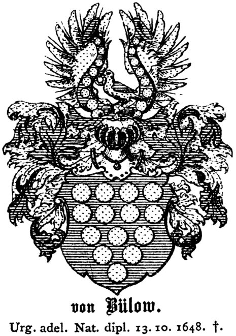 ”En blÃ¥ sköld, deruti 14 förgylda ägg, 4. 4. 3. 2. och 1. bjelkevis lagda; pÃ¥ skölden en öppen tornerhjelm; täcket och kransen med blÃ¥tt och gult fördelte; pÃ¥ hjelmen en förgyld krona, derpÃ¥ stÃ¥r en till venster vänd papegoja mellan 2 blÃ¥ horn med 7 förgylda ägg, midt uppÃ¥ hvarandra längs efter satta.”
