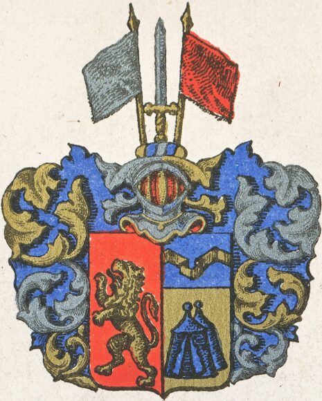 …Skiölden fördeelt i Längden uti Twänne lijka deelar, det högre Fältet är Rödt, ock derutj ett Leijon af gull. det wanstra Fältet är Fördelt med en Blå Cheff, hwaruti ligger en Skantz af gull, det nedre Fältet är af gull uti hwilcket wijser sig ett Blått Tält. Åfwan på Skiölden är en Öpen Tornerhielm, hwar öfwer står en uprätt wärja emellan Trenne Fahnor, af hwilcke den högre är af Sölfwer ock den Wänstra Rödh, Crantzen ock löfwärket är af gull, Sölfwer ock blått, Aldeles som det med sine egentelige färgor härhoos afmåhlat finnes….