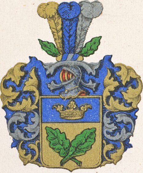 ..En Skiöld af Gull med en Blå chef hwarj lijser en Crona af Gull, men i det nedre fältet, stå twänne gröne Kårßwijß stälte Eckelöf, Åfwan på Skiölden står en öpen Tårnerhielm, hwarutur uppstijga trenne Plumager med gull blåt och Sölfwer; hwarom annan fördeelte, emellan twänne gröna Eckelööf. Crantzen och löfwärcket är af Gull Sölfwer och Blått, …..