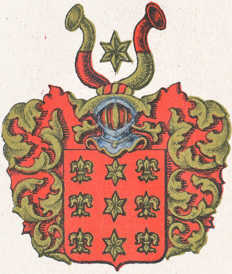 ”… En röd Skiöld, hwaruti Trenne Sexuddade stiernor aff gull stälte under hwar andra, och på hwardera sijdan om stiernorne en gyllene Lillia, åfwan på Skiölden är en öpen tårnerhielm, hwaröfwer lyser en gyllene stierna emellan ett paar boffelhorn, hwilckes högre öfre och wänstre undre deelar äre aff gull, och de bägge öfrige Röda; Crantzen och Löffwärcket är jämbwäl aff gull och rödt: aldeles som detta Wapn med sine egentelige färgor härhoos afmålat finnes.”