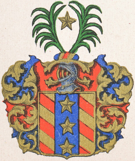 ”… Skiölden fördelt i Lengden uthi trenne lijka delar, sielfwa palen eller det medelste fältet är blått, hwari lysa trenne öfwer hwarandra stälte stiernor af Gull; de begge yttre fälterne äre af Gull, med twenne röda bander i hwartdera fältet. Åfvan på Skiölden står en öpen tornerhielm hwar öfver Lyser een stierna af Gull emellan twenne gröna Palmqwistar. Krantzen och Löfwärket är af Gull blått och rödt. Aldeles som detta Wapn med sina rätta och egentelige färgor här hoos repræsenterat och afmåhlat står.”