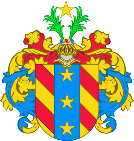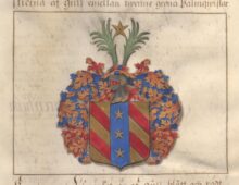 ”… Skiölden fördelt i Lengden uthi trenne lijka delar, sielfwa palen eller det medelste fältet är blått, hwari lysa trenne öfwer hwarandra stälte stiernor af Gull; de begge yttre fälterne äre af Gull, med twenne röda bander i hwartdera fältet. Åfvan på Skiölden står en öpen tornerhielm hwar öfver Lyser een stierna af Gull emellan twenne gröna Palmqwistar. Krantzen och Löfwärket är af Gull blått och rödt. Aldeles som detta Wapn med sina rätta och egentelige färgor här hoos repræsenterat och afmåhlat står.”