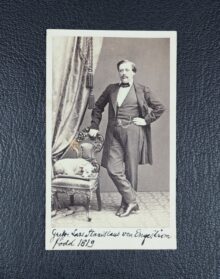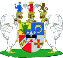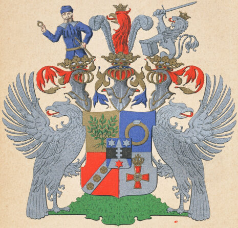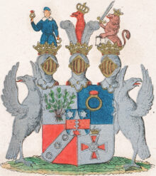 ”… En i fyra delar klufven och tvärdelad Sköld, midtpå belagd med en Hjert-Sköld, innehållande Ättens Stam Wapen eller en blå Sköld, som är styckad och ginstyckad till en upstående Spits af Silfver och tvärtöfver belagd med en svart bjelke, i midteln af hvilken står ett Ärke-Biskopps eller dubbelt Kors af Silfver, varandes i hvardera af de blå eller sidofälten en sex uddig Stjerna af Silfver och under bjelken en dylik af röd färg. Af Grefliga Sköldens fält är det öfra högra af Guld, hvaruti ses fem gröna hopbundna Oljo-Quistar. I öfra vänstra fältet åter, som är blått, står Polska Revolutions Ringen af Guld. Nedra högra fältet innehåller Polska Ätten Clapowskis Sköldemärke: en i rödt fält ställd Ginbalk af Silfver, prydd med trenne efter hvarandra lagda, Smycken af gula ädla Stenar. I nedra vänstra fältet, som är af Silfver, visar sig Konung Carl XIII:s Ordens Kors. Skölden prydes af trenne med Grefve Kronor betäckte öpna Tornér Hjelmar, af hvilka den medlersta bär Ättens gamla Hjelmprydnad: Ett Krönt rödt Örnhufvud emellan tvenne hvita Strutsfjädrar. På den högra upreser sig till hälften en Man i blå Polsk Drägt med högra handen framräckande Polska Revolutions Ringen af Guld, och hållande den vänstra på Fästet af sin Sabel. På den vänstra Hjelmen ses öfra hälften af ett sig resande till höger vändt Lejon som håller i högra ramen ett dragit Svärd, men den vänstra på en öppen Bok. Skölden hålles af tvänne hvita Örnar med upåt slagna vingar, stående på en grönskande Mark. Aldeles, som det med sina rätta och egenteliga färgor här afmåladt finnes.”