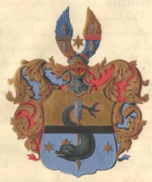 ”… En Skjöld, medelst en smal svart Bjelke delad i tvänne Fält, hvaraf det öfra är af gull, men det nedra blått. En Delfin af naturlig färg uppreser sig så i bägge fälten, at dess med öpen gyllene Krona betäckta och till höger vända hufvud står i nedra fältet, med kroppen tillbakaböjd åt höger, hvaremot andra delen af kroppen ses i öfra fältet, slängande Stjerten åt vänster bakom blå Fjädern af en genom Delfinen lodrätt stungen gyllene Pil: warandes förenämnde bjelke frammanföre altsammans, samt Delfinen åtföljd i nedra fältet af en sexuddig gyllene stjerna å hvardera sidan. På Skjölden hvilar en öppen Torner-Hjelm, belagd med en af gull, blått och rödt sammanvriden Hjelmkrans, öfver hvilken sväfvar en gyllene sexuddig stjerna, imellan tvänne åt hvar sin sida utåt fläcktande Wingar, af hvilka den högra är tvärdelad med en Bjelke af silfver, samt öfver densamma blå och undertill af gull, men den vänstra tvärdelad af en röd Bjelke, öfver densamma af gull och undertill blå: wisande sig på hvardera Wingen en med spitsen upåt, lodrätt, bakom bjelken ställd pil, som på högra wingen är af gull med blå fjäder, men på vänstra wingen blå, med fjäder af gull. Skjölden omgifves af Löfwerk, som utvändigt är af gull och innantill växelvis af blått och rödt: Aldeles som det här frammanföre med sina rätta och egenteliga Färgor afmåladt finnes.”