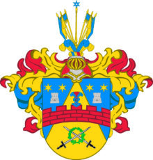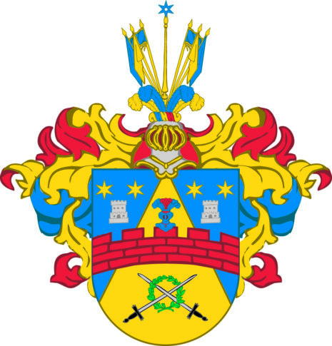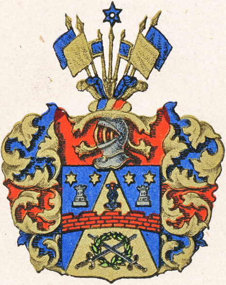 ”… En Blå Skiöld, hwarutinnan En Guld-Spets Uprest är, Öfwerlagd med En Röd Mur, Bielkewis af Tre Stenars högd och Fem Tinnar: Uppå den Medlersta står en Blå Öppen Tornerhielm fram åt wänd, Zirad med Trenne Strutz Fiädrar, den Medlersta Röd och de Yttre Blå: Men under Muren ligga Twänne Swärd, med Swarta Fästen och Silfwer Klingor, Korszwis stuckne igenom en Grön Lager Crantz: Åfwanföre är Spetzen sidosatt å Ömse sidor med Ett Silfwer Castell, hwaröfwer Twenne Sexuddige Stiärnor af Guld glindra. Ofwan på Skiölden står En Öppen Tornerhielm med En af Guld Blått och Rödt Wriden Hielm Crants, Zirad med Fyra Korta Strutz Fiädrar, de Twå Yttre af Guld, de Inre Blå emellan hwilcka en Gyllende Lance med En Blå Mollet på Spetsen Uprest är, jemte En Blå Estandart och Twå Utslagne Fahnor å hwardera sidan, Den öfra af Guld, Den Nedra Blå. Löfwärcket är af Guld, Blått och Rödt. Aldeles som detta Wapen med sine rätte Färgor härhos afmålat finnes.”