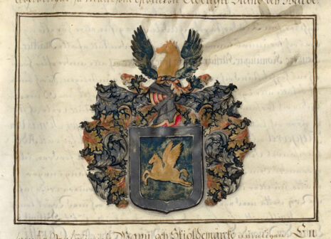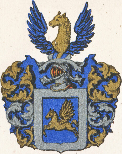 ”… En blå Skiöld med en flygande Pegasus uti af gull; omkring Skiölden löper en borde af Silfwer; Ofwan på den samma står en öpen Tornerhielm; hwarutur sträcker sig ett gyllende Hästehufwud med Halsen, emellan twänne blå utslagne Wingar. Ctantzen och Löfwärcket är af gull, Silfwer och blått, aldeles, som detta Wapn med des egentel. färgor här hos afmålat finnes.”