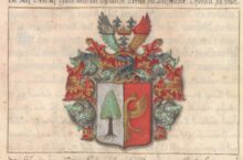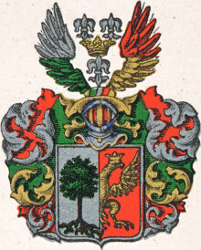 ”… En Skiöld i längden fördelt i twänne lika delar, warandes det högre Fältet af Silfwer, uti hwilket står ett grönt Furuträ. Det wänstre Fältet är rödt Zirat med en half Örn af Guld med en gyllende Crono på Hufwudet. Ofwan på Skiölden står en öpen Tornerhielm, öfwer hwilken är en gyllende Crona emellan trenne Lilljor af Silfwer, twå öfwer Cronan och en nedan före. På hwarera sidan är en utslagen Winge, den högre af Silfwer och grönt, och den wänstre af röd Färg och Gull, i twären fördelte. Crantzen och Löfwerket är af Guld, Silfwer, rödt och grönt, aldeles som detta Wapnet med sina rätta och naturliga Färgor här hos afmålat finnes.”