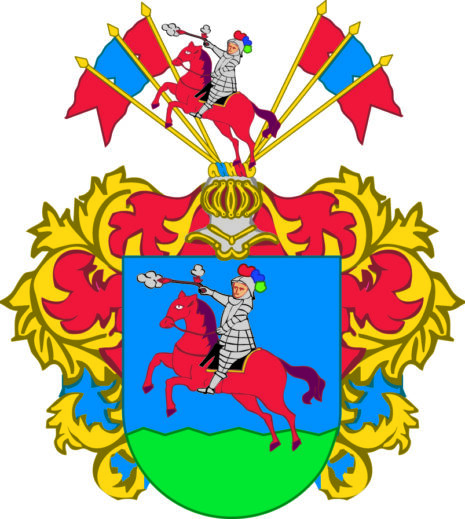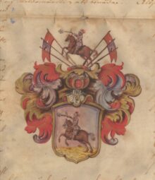 ”… een Sköldh aff ett himmelsblått felt med een gröön Tummellplatz nederst, och der utj een bewäpnad Man, sittiandes på een rödh Häst, och skiütandes een Pistol löös. Ofwan på Skölden een öpen Tornerehiälm, och der uppå een rödh Häst med een bewäpnadt Man, skiutandes een Pistohl löös, äffwen som utj sielwa Skölden. På wardera sijdan om karlen och hästen Tree Standarer, twenne röda och den medlaste blå, Löffwärcket af blå, guhl och röda färgor under hwar andra förmängde, och med små Silfwer strimmor uthzierade, alldeles såsom samma wapen här hoos står måhlat och afsatt.”