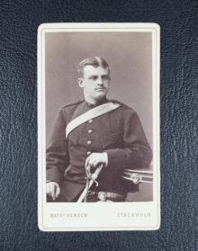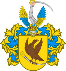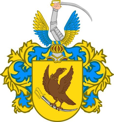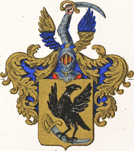 ”… En Sköld af guld, hwaruti ses en till höger wänd Gam af mörkbrun färg med uppåt flaksande wingar och till wenster böjdt hufwud bandewis hållande i klorna en med gyllene fäste försedd dragen sabel, fattande densamma om sjelfwa klingan, hwars egg är nedåt wänd. På skölden står en öppen Tornerhjelm, belagd med en af guld och blått sammanwriden hjelmkrans, hwarur uppreser sig en stålklädd högerarm, i handen hållande bjelkewis åt wenster en huggande blottad sabel, eggen uppåt wettande: stående emellan twenne utåt fläktande wingar, som midtpå äro twerdelade och sins emellan så wexla färger, att den högra är öfwerst af guld och nertill blå, men den wenstra upptill blå och nederst af guld. Skölden omfattas af löfwerk, som i dagen är af guld, men innantill blått; Alldeles såsom Wapnet här med sina rätta och egentliga färger afmåladt finnes.”