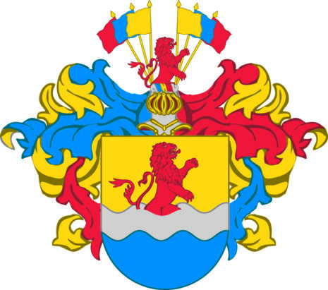 ”… en av en ström (av silver) i guld och blått delad sköld, med ett ur strömmen uppstigande (vänstervänt) rött lejon (med tunga och kluven svans). Ovan på skölden en öppen tornerhjälm. Kransen och lövverket är fördelat med silver, rött, guld, blått och silver. Där uppå ett uppstigande (vänstervänt) rött lejon (med tunga och kluven svans) på vardera sidan åtföljt av tre standar i guld, blått och rött (räknat inifrån och ut).”