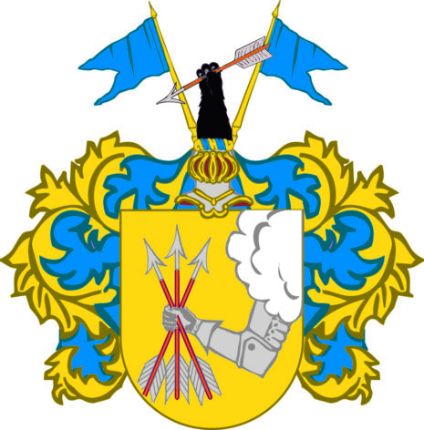 ”… Skölden guul, dher vthi en bewäpnadh arm, hwilcken sigh sträcker vthur een sky, och fattar medh handen 3 flitzer eller skäcktar, ofwan opå Skölden een öpen Tornerehielm, hielmtecket och Crantzen medh blåth och guult fördeelte, ofwan opå hielmen en biörnefoot, fattande medh ramen en skächta och hafwande på hwarthera sijdan en blå Fahna, aldeles såsom det medh sine egentlige färgor är repræsenterat och afmålat står; …”