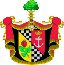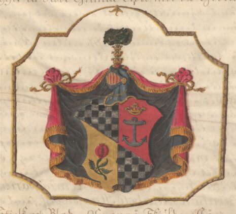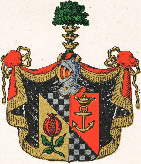 ”… En Skiöld först mitt i tu, och sedan ifrån höger Twärklufwen: warandes Klyffterne af Silfwer och swarta Schachsspehls-rutor fylde. I det öfwersta Wenstra Fältet, som är Rödt, wisar sig ett Silfwer-Ankar, hwaröfwer en Gyldene Crona swäfwar: men i det högre understa Fäldtet, som är af Guld, ligger ett Rödt Granat-Äple med des Gröna Stielk och Blad. Ofwanpå Skiölden står en Öpen Torner-hielm, hwaruppå en Grön löfwad Eek hwilar, hwars stam är omgifwen af Trenne öfwer hwarannan stående Guld-Cronor. Hielm-Crantzen och Täcket är af Guld, Rödt och Swart: aldeles som samma Wapen med sine egentelige färgor härbredewid finnes afmålat.”