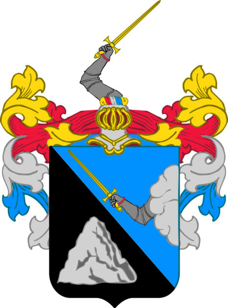 ”… En i twenne lika delar styckad Fransk Sköld, i hwars högra fält, som är swart, ses ett fritt stående spetsigt Berg af silfwer. I wenstra fältet åter, hwilket är blått, framsträcker sig, utur en wid wenstra kanten warande silfwersky, en böjd, i silfwer klädd, bewäpnad arm med röd stoffering wid handen, som bandewis håller ett swärd med gyllene så wäl klinga som fäste. Uppå skölden hwilar en öppen Tornerhjelm, belagd med en af guld, silfwer, blått och rödt sammanwriden hjelmkrans, ur hwilken uppreser sig en krökt äfwen i silfwer klädd bewäpnad arm, barrewis hållande ett swärd af guld. Skölden omgifwes af löfwerk, som wexlar på begge sidorna lika, af guld, silfwer, blått och rödt; Alldeles såsom Wapnet här med sina rätta och egentliga färger afmåladt finnes.”
