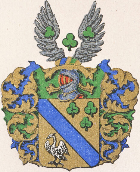 ”. . . En Skiöld af gull, hwaröfwer gÃ¥r en blÃ¥ bande emellan trenne gröna klöfwerblad och en Häger; Ofwan pÃ¥ Skiölden stÃ¥r en öpen Tornerhielm, hwaruppÃ¥ är ett grönt klöfwerblad emellan twenne utslagne wingar af gull, hwardera med ett lika blad Zirade. Krantzen och Löfwärcket är af gull, blÃ¥tt och grönt: som detta Wapnet med sine rätta och naturlige färgor härhoos afmÃ¥lat finnes.”