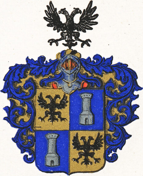 ”… En fyrdelad Sköld, uti hvilken, i det första och fjerde Fältet, som är af guld, synes en uprättstående tvehöfdad Svart Örn med utslagna vingar; och i det andra och tredje fältet, som är blått, ett vårdtorn af Silfver. På Skölden hvilar en öppen Tonerhjelm, prydd med en af blått och guld virad hjelmkrans, ofvanpå hvilken höjer sig en swart tvehöfdad Örn med utsträckta wingar. Skölden omgifves af Löfverk, innantill af guld och på yttre sidan blått; aldeles såsom samma Wapen här ofwan med sina rätta och naturlige Färgor afmåladt finnes.”