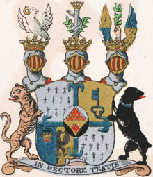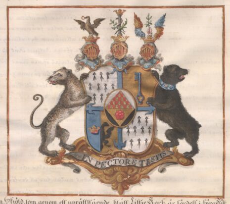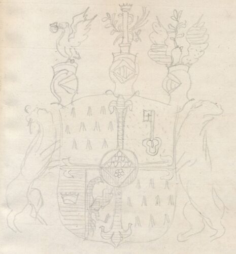 ”… En Skiöld, som genom ett uprättstående blått Lillje Korss är fördelt i fyra Fält. Midt uti den samma wisar sig det Förra Adelige Wapnet förändrat medelst en Oval Skiöld, från hwars bägge Sidokanter sträcker sig med Spetzen up til den Öfra en Trehörning af Vairé uti Silfwer Fält, och lika så en med Röd Ros belagd Gyldene Trehörning med Spetzen till nedre kanten uti swart Feldt, i så måtto, at bägge desse formera en uprättstående Ruta. Af det Grefweliga Wapnet äro twänne Silfwer-Feldt, nämligen: Det Första til Höger och det Fierde til Wenster, hwardera prydde med Tio i Tre Rader hängande Hermeliner. Uti det Andra Fältet til Wenster, som är af Guld står en med Axet til Höger up åt Wänd blå Nyckel, och uti det Tredie Fältet, som är klufwit i Twänne delar, wisar sig i den blå delen til Höger en öpen Gyldene Krona samt i den Wänstra, som är af Guld, hälften af en fläkter Kejserlig swart Örn. Ofwanpå Skiölden stå Trenne med Grefweliga Kronor prydde Öpne Tornere Hielmar. Uppå den til Höger står en åt samma sida sig wändande Falk i Naturlig färg med til flygt utslagne wingar, bunden om hwardera benet med en blå sno och en Silfwerbiälra, hållandes i Nebben en Guld Pitschers Ring. Uppå den til Wenster, stå Twenne emot hwarandra utslagne och til hälften i Guld och Blått skiftande Örnewingar, emellan hwilka wisar sig en Hand i naturlig färg, som håller en uprättstående Grön Oliweqwist. Uppå den Medlersta Hielmen står en med Open Gyllene Krona betäkt Silfwer Pelare, omgifwen med en Orm och prydd med en deröfwer i Korss lagd Oliwe- och Palmqwist, bägge i grön färg, sträckande sig den förre til Höger och den sednare til Wenster. Skiölden hålles til Höger af en Leopard i dess Naturliga färg, och til Wenster af en swart Biörn, prydd med ett Blått Halsband, hwaruti lyser en Silfwer Stierna emellan Twänne Moletter af samma Metall: Wändandes Bägge sina Hufwuden utifrån Skiölden. Aldeles som detta Wapen och Skiöldemärke med sine rätte och egentelige Färgor härofwan afmåladt finnes.”