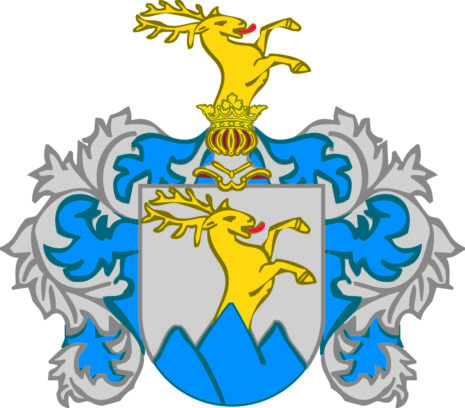 ”… en hwijt Skölldh, där vthj en guul Hiort springandes uthur ett blått Bärgh medh (oläsbart) främbsta deelen; åffwan oppå Sköllden en öpen Tornerehielm, och uppå then en Chrona uthur hwilken äffwen så en halff hiorttt ståhr, Täckhedh och Crantzen medh blått och hwijtt fördeelte Zijrade och beprydde alldeles som detta Wapen medh siene egentlige färgor här hoos Repræsenteradt och affmåhlat finnes, …”