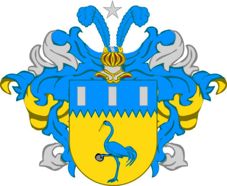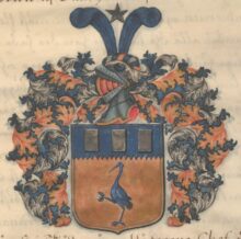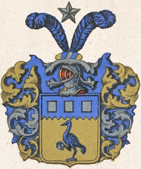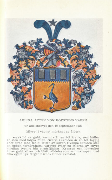 ”… En Skiöld af Guld, hwaruti står en blå Trana, som håller en Sten med högra Foten. Öfwerst i Skiölden är en blå taggug Chef, Zirad med tre Billetter af Silfwer. Ofwan på Skiölden står en öpen Tornerhielm, hwaröfwer lyser en Stierna af Silfwer emellan twenne blå Strusz-Fiädrar. Krantzen och Löfwerket är af Guld, Silfwer och blått, aldeles som samma Wapn med sina egenteliga Färgor här hoos finnes afmålat.”