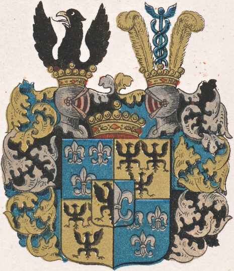 ”… En Skiöld fördehlt i fyra Fällt, och mitt uppå fördehlningen des gamla Adelige Stamm-Wapen, som är en i längden fördehlt Skiölld, warandes det högra Fälltet af Gull, med en half swart Örn uti, det wänstra Fälltet är af blå Färg, hwaruti är en i längden half afskuren Lillia af Silfwer, som stödier sig emot Örnen; Men af sielfwa Frijherrlige Wapnet, är det första Fältet blått, med trenne försilfrade Lillior uti; Det andra Fälltet är af Gull, uti hwilcket sees tre swarta fläckte Örnar; Det tredie Fälltet är i alt lijkt med det andra; Så och det fierde med det första. Ofwan på Skiölden stå twenne öpne Tornerhielmar med en Frijherrligh Crona emellan och en på hwardera Hielmen; Utur den högre Hielm-Cronan sträcker sig öfre delen af en swart Örn med utslagne wingar, och uppå den wänstre står en blå Mercurii Staf, emellan twenne Strussfiedrar af Gull; Löfwärcket är af Gull, Silfwer, Blått och Swart, aldeles som detta här hos stående Wapnet med des rätta och egenteliga färgor afmåhlat utwijsar; …”