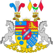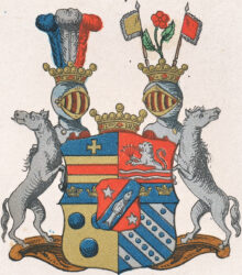 ”… samt till förbättring på deβ adeliga wapen, En fyrdelad Skiöld, uppå hvilcken en hiertskiöld är Lagd, som StamVapnet innefattar, neml. Ett Rött Fält, hwaruti en blå ginbalck sig wisar, som med en silfwer giers belagd samt af twenne fem uddiga Silfverstiernor fölgd finnes, Twert öfver friherre wapnet ligger en blå bielcke, märkt med fyra gyllende Cronor, twå af hvardera sidan af hiertwapnet; och är första fältet af samma Vapn, hwilcket wäxelwis af Rödt och guld består, med en blå ginstam deladt, hvarutti et gyllende kors sees, Det andra är Rödt, och föreställer twenne bielckewis gående gyllende Strömmar, hvarutur et gyllende emot höger wändt Leijon som med högra foten förer siex stycken sammanbundne Pilar, upstiga synes. Det tredie är af Guld, och förekommer deruti Tre blå Kulor, Twå och en, Och dett fierde Blått, som innehåller fyra Silfverbalckar, hvaraf den första och fierde med En samt den andra och tredie hvardera med fem blå Kulor belgde äro; Ofvan på Skiölden stå Twå emot hvarannan vände öpne krönte Torner Hielmar och emellan dem en friherlig krona. På den första är en af Tre Strutsfiädrar ihopfogad Plumage att see, hvaraf den första blå den andra hvit och den Tredie Röd föreställes. Utur den andra upwäxer en Röd med twänne gröna blad beprydd TörneRoos, som till höger af ett gyllende till wänster åter af ett Rödt Estandart fölgt blifver. Skiöldhållare äro Tvenne sig emot Skiölden lutande och tilbaka seende modige grå hästar. Aldeles som samma wapn med des egenteliga Färgor här hos finnes afmålat.”