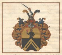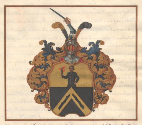 ”… En midt uppå twärdelad Sköld, öfre delen af Guld, der uti upstiger en sotig Kolare i Swart Drägt med Gyllene Knappar, hållande i sin Högra Hand en Swart Brinnande Eld-Brand. Nedre delen åter Swart, och der uti en Sparre af Guld, belagd med Twänne Swarta Eld-Bränder. Uppå Skölden är en Öppen Torner-Hjelm, hwar utur en Stål-klädd Blå Höger Arm, omknuten af ett Hwitt Kläde, upräcker en Wärja, hwars Klinga är Blå, men Fästet af Guld, mellan Twänne Strusz-Fjädrar, den till höger ofwantill af Guld, och nedantill Swart, samt den wänstra ofwantill Swart, och nedantill af Guld. Krantsen är wriden af Guld och Swart, och Löfwärket är i Dagen af Guld, samt i grunden Blått och Swart til skiftes. Alldeles, som detta Wapen och företecknade Sköldemärke med sina rätta Färgor här hos afmåladt finnes.”