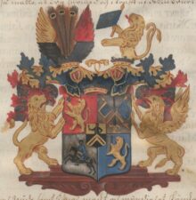”… En Skiöld fördelt i fyra Fält, och mitt uti den samma des gamla Adelige Stam-Wapn, som är en i twäran afskuren Skiöld i twänne delar, warandes det öfre fältet af gull, hwaruti wisar sig öfra delen af en Morian klädder i en swart lijf Råck med gull knappar uti, som håller med högra handen en swart eldbrand, det andra Fältet är swart, med en förgylt Sparre uti, på hwilcken sees twänne swarta eldbrandar. Men af sielfwa Frijherrlige Wapnet är det första fältet Rödt, hwaruti står ett gyllende Leijon, hållandes med högra ramen en Silfwer molet; det andra Fältet är af Silfwer i hwilket sees en baar Wäria emellan ett blått Estandar och en Fahna af samma färg, som äro korsz-wijs stälte; Uti det tredie Fältet, som äfwen är af silfwer, rider en blå klädder Karl, på en swart Häst, hållandes en Wäria med högra handen. det fierde Fältet är blått, med ett stående Leijon utaf gull, som håller med ramarne ett försilfrat Stycke. Ofwan på Skiölden stå twenne öpne Tornerhielmar med en Frijherrlig Crona emellan, och en på hwardera Hielmen. På den högra Hielmen äro tre Påfogle Fiädrar, emellan twänne utslagne och i twäran fördelte wingar, hwar af den högre är af gull och swart, och den wänstra af röd färg och Silfwer, utur den wänstra hielm-Cronan sträcker sig öfra delen af ett gyllende Leijon, som håller med högra ramen en utslagen blå Fahna; Löfwärcket är af gull, silfwer, blått och rödt, och sielfwa Wapnet Supporteras af ett förgylt Leijon och äfwen sådan Grijp, aldeles som detta Wapn med des rätta färgor på andra sidan afmålat finnes.”