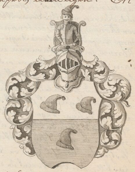 ”… En midt uppå twärdelad Swensk Sköld, hwarutinnan Sees Twänne Röda långa Jude Mössor, Twå i det Öfra och En i det Nedra Fältet, prydde i ändarne med röda och hwita Tofsar; warandes Sköldens Öfra Fält af Silfver, och det Nedra Blådt. Uppå Skölden är en öppen Torner Hielm, hwarest en half i Blådt Harnesk Klädd Man Sitter uti en Gyllende LänStol, hafwandes på hufvudet en lika Röd Jude-Mössa, som uti Skölden. Krantsen är af Silfwer, Blådt och Rödt, och Löfwärket är i Dagen af Silfver, Samt i grunden Blådt och Rödt till Skiftes: Aldeles som detta Wapen med Sina rätta Färgor här hos afmåladt finnes.”