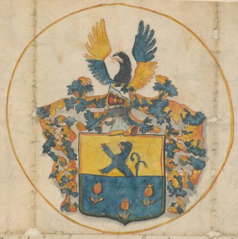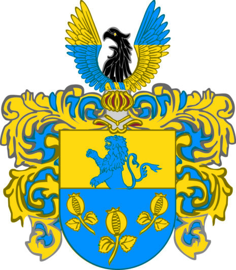 ”… Skiölden fördeeld i twäran i twenne lijka deelar, det öfre Fältet är af Gull, hwarutj wijsar sigh öfre deelen af ett blått Leijon, det nedre Fältet är blått, och deruthi Trenne granat Äpplen af Gull, ofwan på Skiölden står een öppen Tornerhielm, hvaruthur opstijger ett swart Örnehufwudh emellan ett pahr Wingar, hwilkas högre öfre- och wänstre nedre deelar äre af Gull, och dee öfriga begge blå, Crantzen och Löfwärket är af Gull och blått, aldeles som sielfwa Wapnet medh des egentelige Färgor här hoos tecknat och afmåhlat står, …”