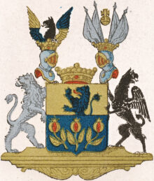 ”… En Sköld fördelad i tväran uti tvänne lika delar, det öfra fältet är af guld, hvaruti ses öfre delen af ett blått Lejon; det undra fältet är blått och deruti tre Granat-äplen af guld. Ofvan på Skölden hvilar en Friherrlig krona emellan tvänne öpna med dylika kronor prydda Tornerhjelmar. Från den högra hjelmen upstiger ett svart Örn-hufvud emellan ett par wingar, till ena hälften af guld och till den andra blå. Uppå vänstra hjelmen höja sig fyra hvita Fanor med gyllene spetsar, tvänne åt hvardera sidan utåt lutande, och emellan dem visar sig Uplands wapen: Riks-äplet, eller en med en gördel belagd och korss prydd Glob af guld. Skölden som hvilar på en gyllene fotställning, uppehålles af tvänne Sköld-hållare, den högra ett Lejon i naturlig färg och den vänstra en swart Grip, båda med tillbaka vända hufvuden. Aldeles som detta Wapen med sina rätta och egenteliga färger här frammanföre afmåladt finnes.”