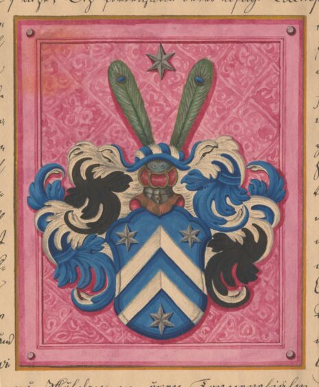 ..En blå Sköldh, der vthj twenne Sparrar, medh trenne Stiernor, twenne öfwer och en Vnder; Ofwan på Skölden en öpen Tornerehiälm, Crantzen och hiämtäcket medh hwitt, Swart och blått fördeelt; Ofwan på Hiälmen twenne Påfågelfiedrar, der öfwerst emillan står en Stierna, aldeles som sielfwe Wapnet här mitt opå medh sine egäntlige färgor repraSenteradt och afmåhlat står;…