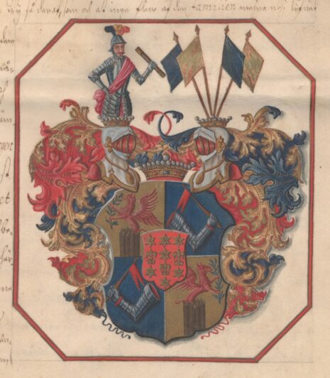 ”. . . Een fyradubbell fördeelt skiöldh, der mit uthi hans förre vapn, som är siu stiernor och tree lillior af guhl ferga uthi rödt feldt. Uthi den öfverste skölden pÃ¥ högre och nederste pÃ¥ vänstre sijdan upstiga tvenne röda gripar uthur tvÃ¥ skantzkorgar, hollande medh kloerne tvenne gröna olliequister. Uthi den öfverste skölden pÃ¥ vänstre och nederste pÃ¥ högre sijdan äre tvenne beväpnade armar, hollandes hvardera en standart af rödh färga uthi blÃ¥t feldt. Ofvan pÃ¥ skölden tvenne öpne tornerehielmar, täcket och crantzen medh rödt, guhlt och blÃ¥t fördeelte; hvardere hielmen medh een frijherre chrono opÃ¥; öfver den högre hielmchronan ståår een half beväpnadt man, hafvandes kring sigh ett rödt feldttecken och hollandes i högre [vänstra enl. vapenmÃ¥lningen!] handen een commandostaf, och öfver den vänstre hielmchronan fyra fahnor af guhl och blÃ¥ ferga; aldeles somheele dette vapnat pÃ¥ andra sidan afmÃ¥hlat och repræsenterat stÃ¥r. . . .”