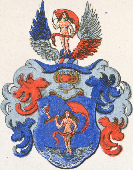 …Skölden blåå däruthi fortuna huilken står på en flygande kugell, och blifuer Vthur skyn fattat medh en arm j ofuan oppå Skölden een öppen Tornerehielm, täcket och Crantzen medh rött, blått och huit fördeelte; åfuan oppå hielmen fortuna stående oppå en kugell, emillan tuenne Wingar af huilke then eena är half blåå och halff huit, Then andra halff huit och halff rödh, aldeles såsom thet medh sine Egentlige Fergor här repræsenteradt och afmåhlat finnes…