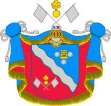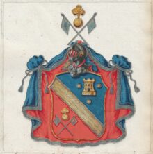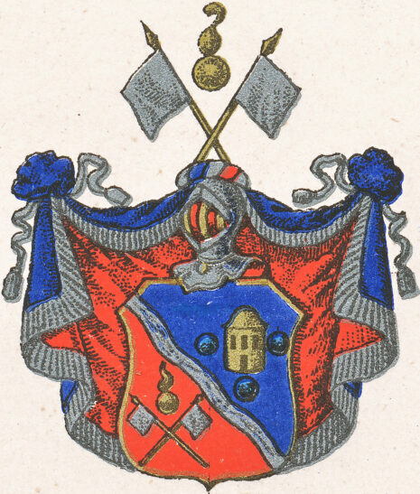 ”… En Sköld, hwaröfwer en Silfwer-Ström Bande-wis flyter. Uti det öfre Blå Fältet står en Borg af Guld, fölgd med twänne Silfwer-kulor å ymse sidor och en dylik under gående. Uti det nedra Röda Fältet wisa sig Twänne kors-wis lagde Quarters Flaggor af Silfwer, och ofwanföre imellan dem en brinnande Gyllene Granat. Ofwanföre uppå Skölden står en öppen Torner-Hielm, med en af Silfwer, Blådt och Rödt wriden Hielm-Krants Zirad, hwaruppå twänne Quarters-Flaggor med en brinnande Granat, lika med dem i nedre Fältet stälte äro. Hielm-Täcket är Blådt, fodradt med Rödt, samt kantadt och upbundit med Silfwer-Frantsar och Toffsade Snören. Alldeles som detta Wapnet med deβ rätta färgor härhos afmåladt finnes.”