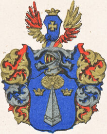 Hjälmprydnad: En blå sköld belagd med ett utböjt kors av silver och krönt med en krona av guld, på vardera sidan åtföljd av en vinge, den högra delad i rött och guld, den vänstra i guld och rött.
