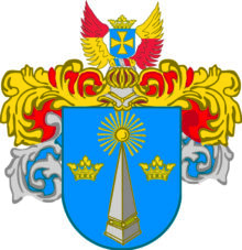 Sköld: I blått fält en pyramid av silver med en strålande kula av guld i toppen, på ömse sidor upptill åtföljd av en krona av guld.