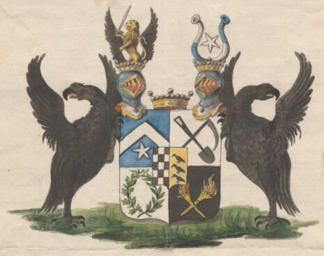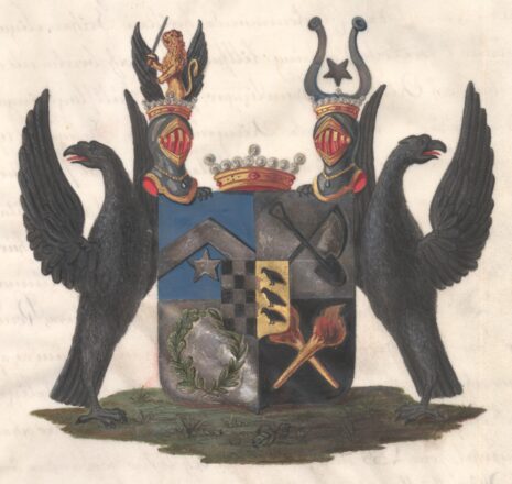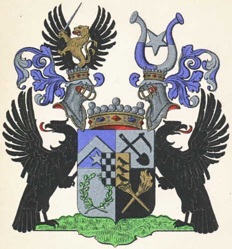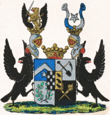 ”… En till fyra fält klyfd och tvärdelad Sköld, midt på hvilken är fästadt Ättens Stam-Vapen: En midt i tu klyfd Sköld, hvars högra Fält utgöres af femton Schack-rutor, växelvis af silfver och svart, tre i bredden och fem i längden, samt så fördeldte, at alla hörn-rutorne äro svarta. I vänstra fältet deremot hvilket är af guld synes tre öfver hvarandra ställda och åt höger vända Kajor af naturlig färg. Den Friherreliga Sköldens öfra högra fält är blått, och deruti uprest en låg Sparre af silfver, under hvilken glindrar en femuddig Stjerna, likaledes af silfver, som är den gamla Store Ättens Sköldemärke. I öfra vänstra fältet, som är af silfver, äro en Lia och en Spade, bägge svarta, i korss öfver hvarannan lagde. Nedra högra fältet är äfven af silfver, hvaruti synes en till sin högra hälft af gröna Eklöf, och till vänstra hälften af gröna Lagerblad sammanvriden krans. Nedra vänstra fältet är svart. Deruti stå tvänne i korss öfver hvarannan lagde, upåt vända gyllende Facklor, med upstigande flammande Eldslågor. Skölden är prydd med en gyldene Friherre-krona, emellan tvänne mot hvarandra vända och med dylika kronor betäckta öppna Tornér Hjelmar. Uppå den högra af dem ses Ättens gamla hjelmprydnad: Öfra hälften af ett uprest åt höger vändt Lejon af guld, med upslängd svans, hållande i högra ramen ett bart svärd med gyllene fäste, och stående emellan tvänne utåt fläcktande svarta örnwingar. Öfver vänstra hjelmen sväfvar en femuddig Stjerna af silfver, emellan tvänne med ändarne utåt böjda Buffel-horn, som så äro skiftevis af silfver och blått, att öfra hälften af det högra och nedra hälften af det vänstra äro af silfver men det öfriga blått. Skölden hålles å hvardera sidan af en svart Örn med utslagna wingar och utåt vändt hufvud samt utsträckt röd tunga, ståendes tillika med Skölden på en grön mark. Aldeles som det med sina rätta och egenteliga färgor här frammanföre afmåladt finnes.”