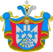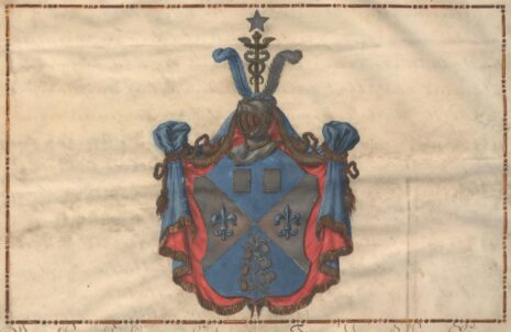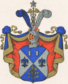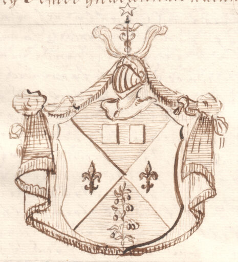 ”… En Fyrsnedad Skiöld, uti hwars Öfre Fält som är Blådt Twenne Silfwer Billetter i bred sig wisa. Bägge sido Fälten äro af Silfwer, hwarthera med en Blå Fransk Lillja mitt uti Zirad. Thet nedre Fältet är Blått, hwaruti en Plommon-Träds-Gren af Silfwer och dylikt Löf uprest är; bärandes å höger (tre-)nne Gyllende och å Wänster Sex Silfwer 1. 2. och 3 öfwer (h)warannan wäxande Plommon. Ofwan på Skiölden står en Öppen Torner Hielm, prydd med en af Silfwer och Blått wriden hielm Krants, hwaruppå Mercurii Staf af Guld, med dylika wingar Öfwerst, och Twenne omkringslingrade Swarta Ormar, stäld är emellan twå Strusz Fiädrar, then Högre Blå then Wänstre af Silfwer: Men öfwer stafwen glindrar en Femuddig Silfwer Stierna. Hielm-Täcket är Blått, fodradt med Rödt, kantadt samt upbundit med Guld Fransar och tåffsade Snören, aldeles såsom thetta wapn med thes egenteliga färgor härhos afmålat finnes.”