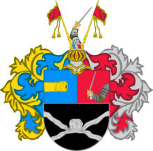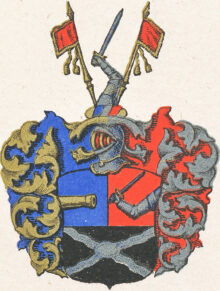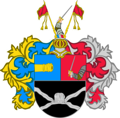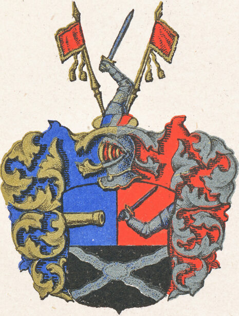 ”… En pa twären klufwen Skiöld, Ofwantill fördelt uti Twenne Fält, af hwilka det högra uti liusblå bottn till höger förer Ett halft guldfärgat Fältstycke, och det wanstra röda eller Rubin färgade till Wänster en bogd stålklädd Arm, hallandes en blottad Wärja med Gyllende Fäste uti handen: Uti Nedre hälften af Skiölden utspringa Korswis af en Kiälla Fyra Silfwerfärgade Strömmar uti swart fält. Ofwan pa Skiölden hwilar en öppen Tornerhielm, täckt med blå, hwit, gul och röd flätad hielm Krantz, hwarifrån upstiger äfwen en sadan Stålklädd Arm med blåttad wärja uti handen, som uti halfwa Skölden emellan Twenne Röde med Guldfranzar och Qwaster utzirade gyllende Estandarer. Löfwarcket är till höger blandat med Guld i Blått, och till Wänster med Silfwer i Rödt Aldeles som detta Wapn med sine rätta fargor harhos afmålat finnes.”