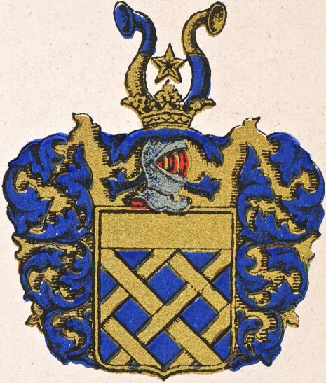 ”… En BlÃ¥ Sköld med en Chef af Guld, hwarunder det nedra Fältet Bande- och Barre-wis öfwer alt är belagt med ett Galler af Guld, sÃ¥ledes att det samma lämnar Fyra hela, och der omkring Ã…tta halfwa Rut-formiga Öppningar. Ofwan pÃ¥ Skölden stÃ¥r en Öppen Tornerhjelm, hwar utur upstiga Twänne af BlÃ¥dt och Guld wäxelwis fördelte Buffel-Horn, mellan hwilka tindrar en Sexuddig Stjerna af Guld. Hjelmen är i stället för krants, krönt med en Gyllene öppen Crona, och Löfwärket är i dagen BlÃ¥dt, och i grunden af Guld: Alldeles som detta Wapen och företecknade Sköldemärke med sina rätta Färger här hos afmÃ¥ladt finnes. …”