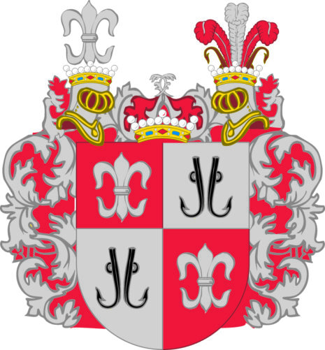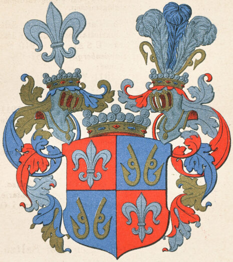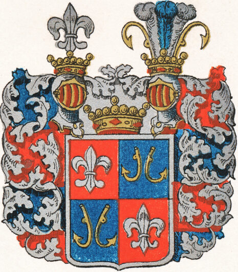 ”En fördelad sköld: warandes högra öfra och wänstra nedre fälten röda, och i hwardera ses en fritt stäld fransk lillia af silfwer. De wänstra öfra och högra nedre fäldten åter äro af wattn? färg eller silfwer och uti hwardera äro 2ne emot hwarannan fälde metkrokar, med utwande spakar i form af anckare, af naturlig eller jern färga. Uppå skölden är satt en större friherre krona, emellan 2ne emot hwarandra wände samt med mindre friherre kronor krönte tornerkielmar. Uti den högra hielmkronan står en fransk lillia af silfwer, och uti den wänstra trenne struska fiädrar: den medlersta af silfwer, och de yttre af röd färg, emellan 2ne up- och nedwände jern färgade metkrokar. Skölden är omgifwen å alla sina öfra sidor med löfwärck som i grund är rödt, samt i dagen af silfwer.”