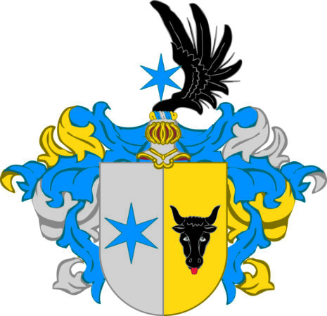 ”… sÃ¥som och confirmera honom fölliande skölldemärke, som han och fäder för honom fördt haffua, nembl: Een fördeelt skölld, den högre sijdan hwiijt, där uthi en blÃ¥ stierna, den wänstre sijdan guhl, haffuandes uthi sigh ett swart oxehuffwud medh uthräckter rödh tunga, offuan oppÃ¥ sköllden en öppen Tornere hiellm, hielmtäcket och Crantzen medh hwitt, blÃ¥tt och guhlt fördeelte; offuan oppÃ¥ Hielmen en swart winge, medh en blÃ¥ stierna framför sigh emot höger, alldeles som det medh sine egentlige förgor här representerat och afmÃ¥hlat stÃ¥r; …”